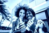 A young couple of African descent enjoying a sunny day at a luxurious poolside, sitting at the pool's edge with drinks in hand. A perfect vacation concept.