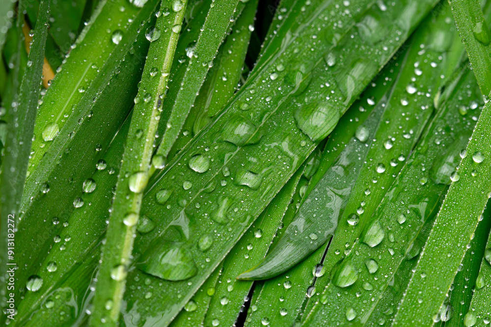 A photo of dew drops on green grass.Morning moisture.Natural green background of nature.