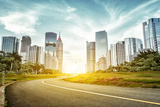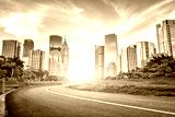 asphalt road and skyscrapers under sunbeam
