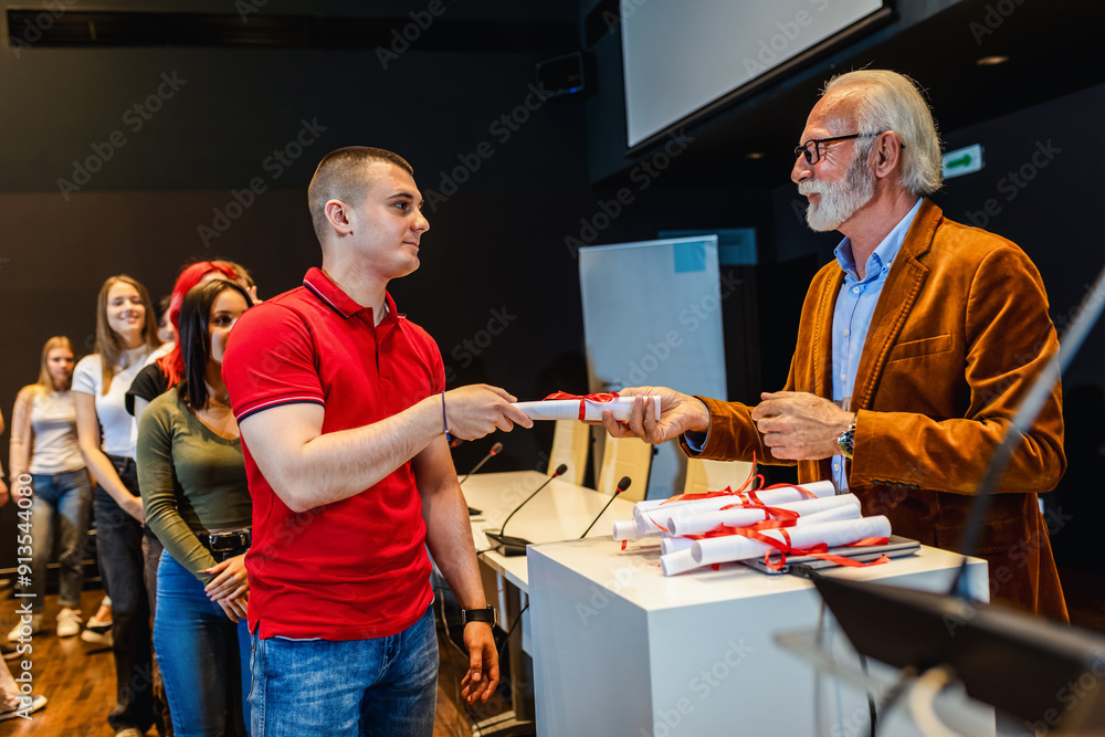 Elderly male professor awarding diploma to hard working student at the end of an year.