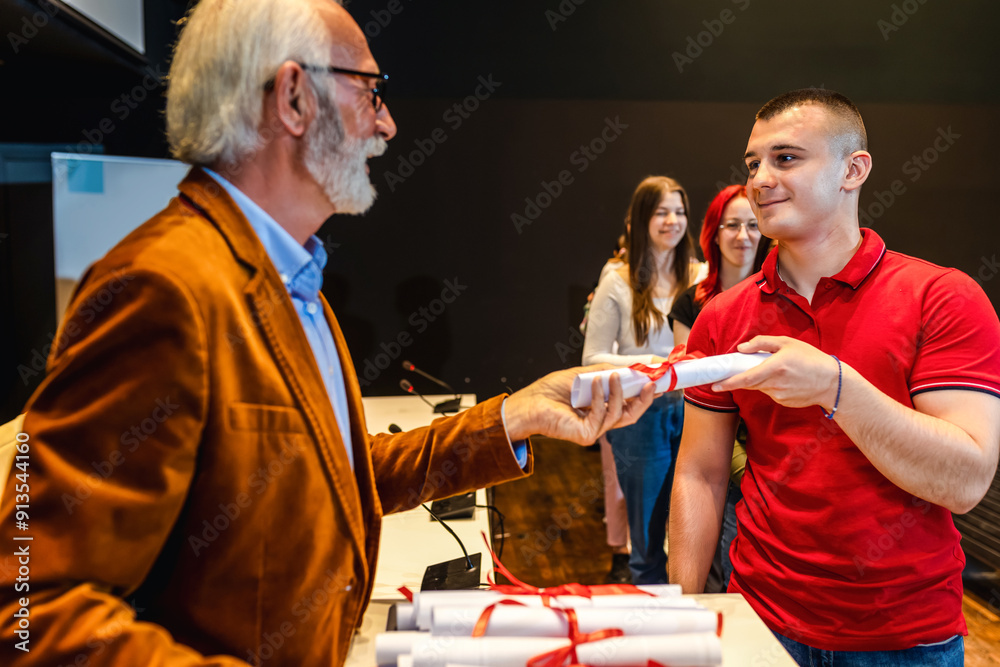 Elderly male professor awarding diploma to hard working student at the end of an year.