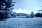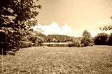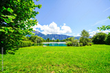 View of the Hödenauersee near Kiefersfelden in the Rosenheim district in Bavaria. Landscape by the lake with the surrounding nature. Inntal South landscape protection area.