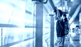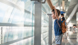 Child with backpack holds railing, gazing through glass at modern airport waiting for take off