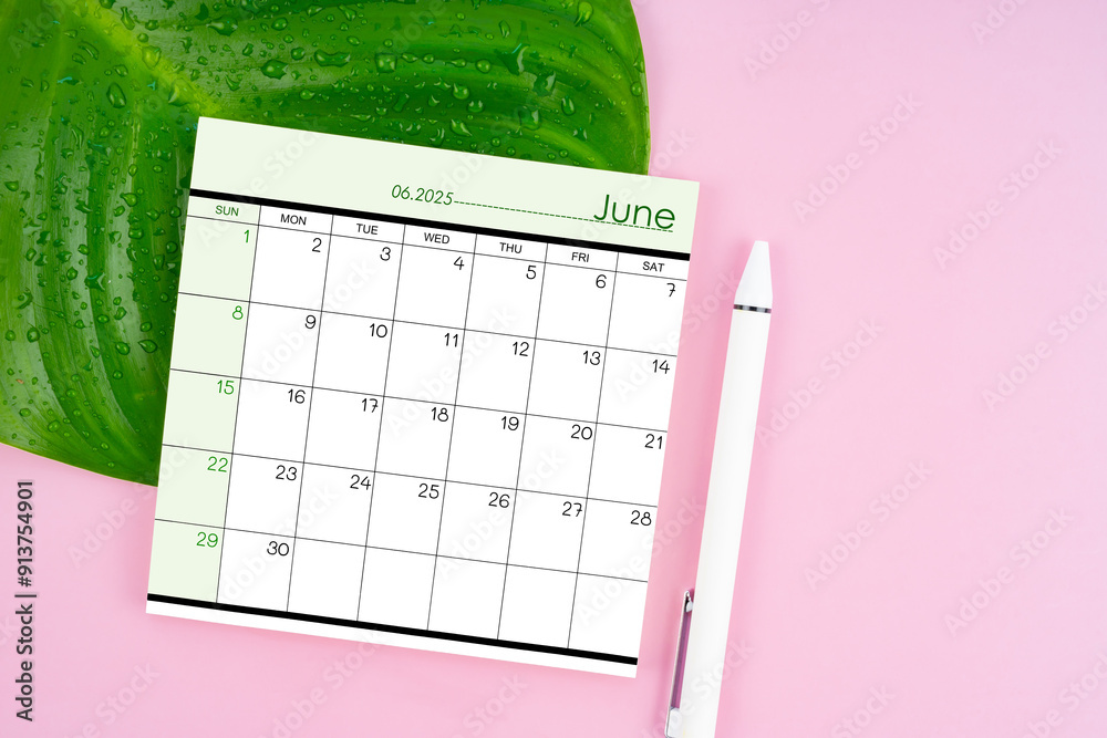 June 2025 calendar page and fresh green leaf with water drops on pink background.
