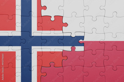 puzzle with the colourful national flag of poland and flag of norway .