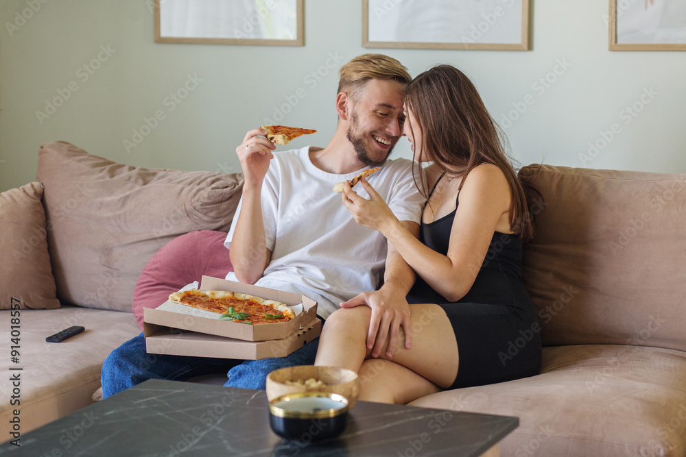 Couple Enjoying Pizza on Cozy Sofa. Family time.