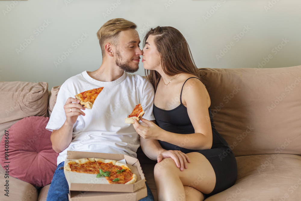 Couple Kissing and Enjoying Pizza on Couch. Family time.
