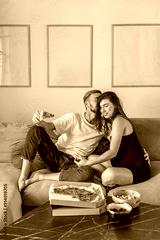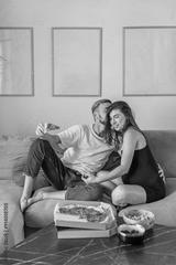 Couple Sharing Pizza and Intimate Moment on Couch. Family time.