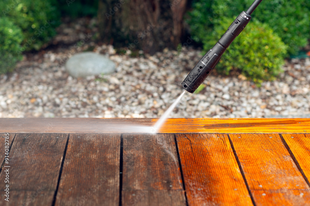 cleaning terrace with a power washer - high water pressure cleaner on wooden terrace surface