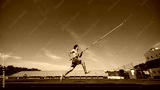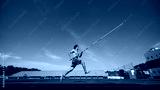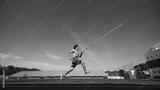 High jump training in progress, with a strong and focused pole vaulter in motion, running wit pole at outdoor stadium. Concept of sport, competition, tournament, active lifestyle, strength. Banner