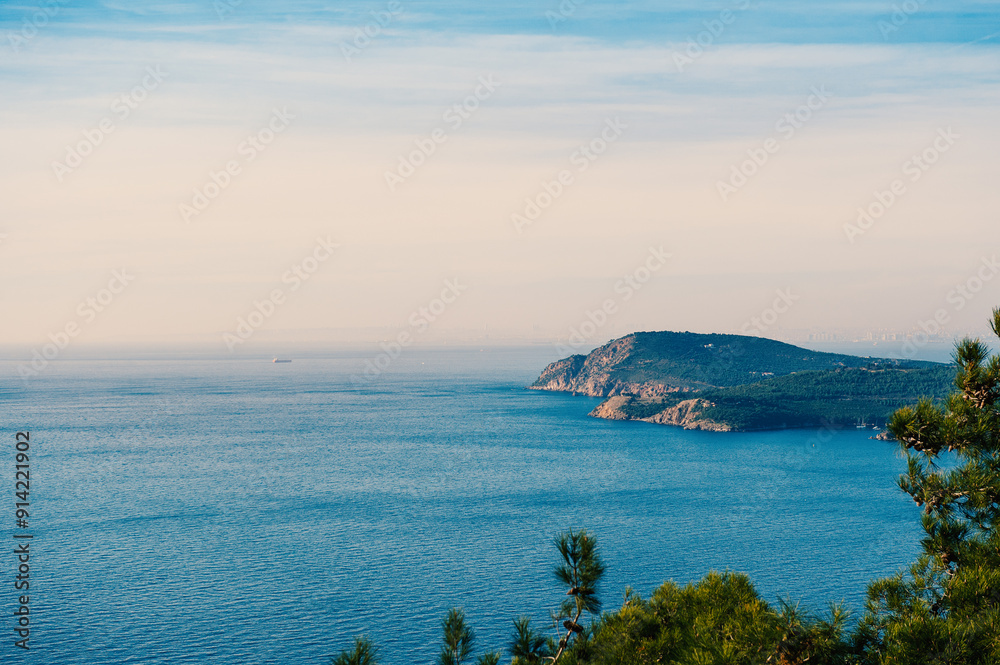 Scenic view of the sea and distant islands from Buyukada, Istanbul, framed by pine trees