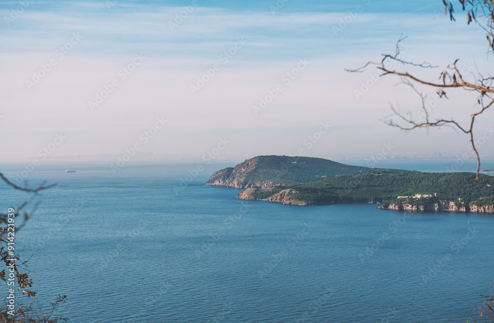 Scenic view of the sea and distant islands from Buyukada, Istanbul, framed by tree branches