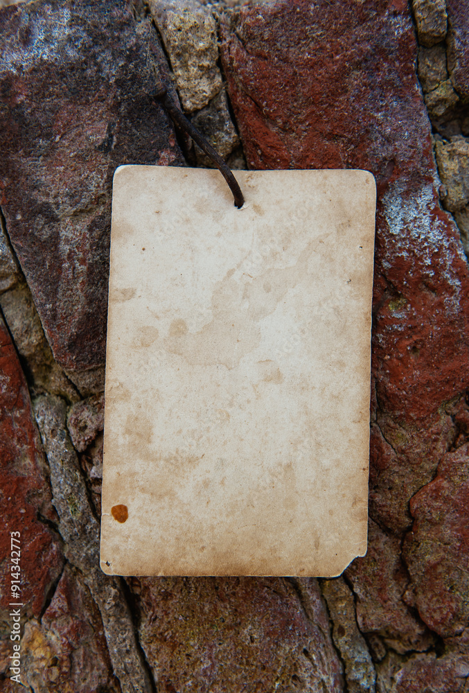 Old vintage paper advertisement hanging on aged red brick wall nailed by rusty doornail