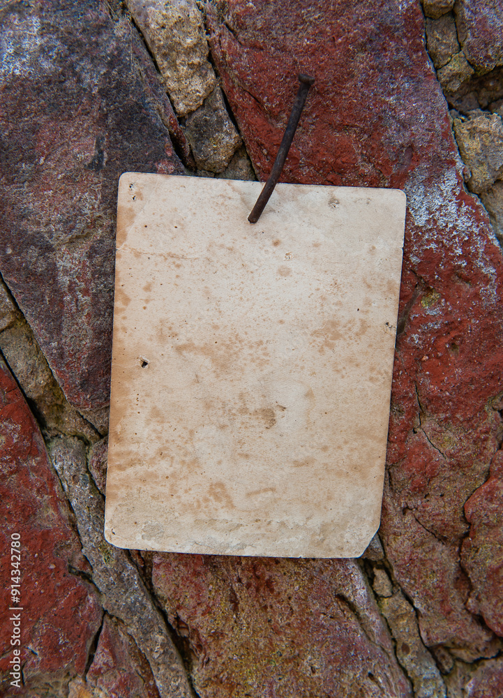 Old vintage paper advertisement hanging on aged red brick wall nailed by rusty doornail