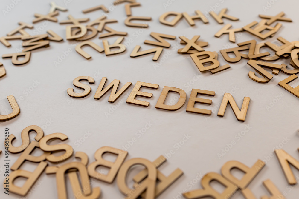 The inscription "Sweden" made of wooden letters. Countries of the world. Countries. Sweden. The name of the countries