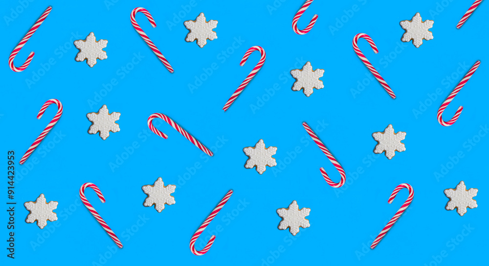 Christmas decoration on the blue background. Top view. Flat lay.