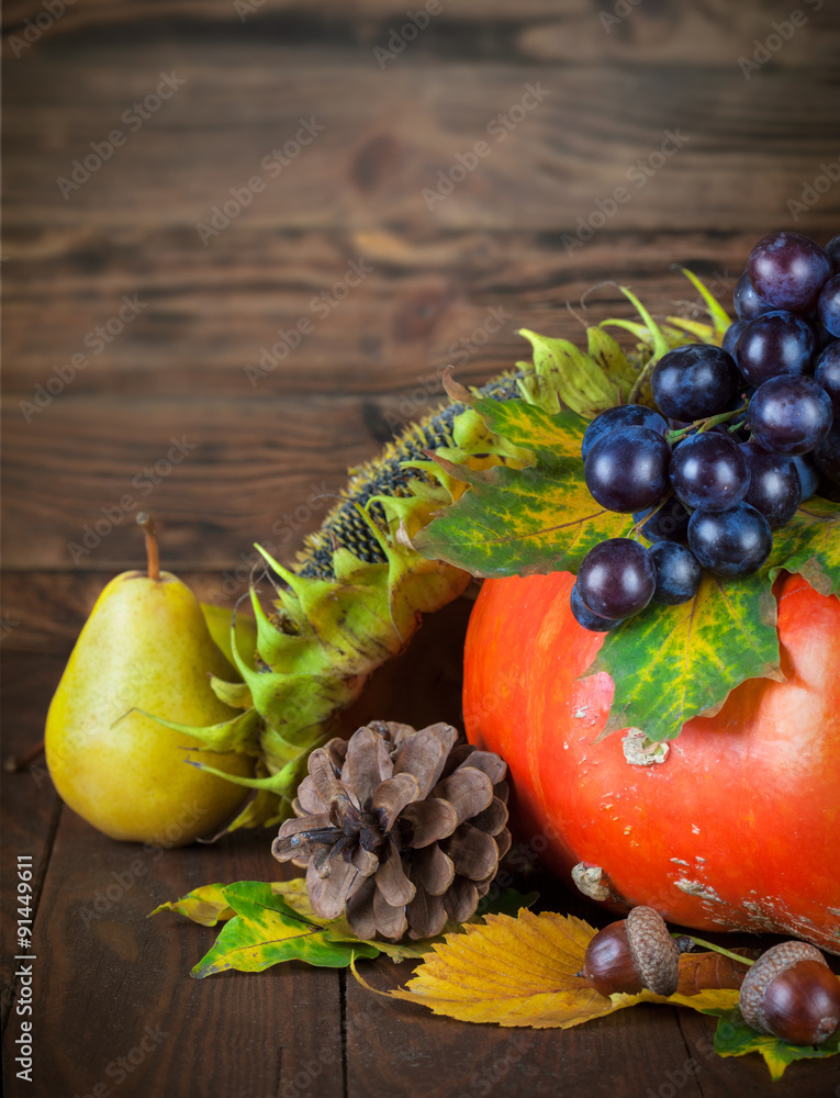 Autumnal still life with pumpkin and grapes on wooden board