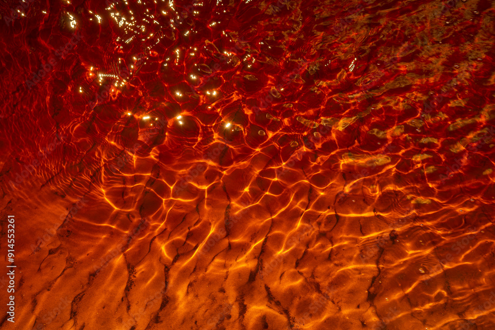 Close-up view of sunlight reflecting on rippling water, creating a vibrant display of red and orange hues. The dynamic interplay of light and color forms an abstract and captivating pattern.