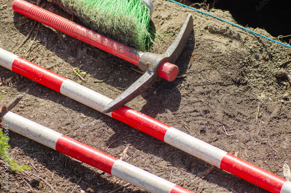 range poles, pickaxe and broom in an archaeological dig, concept of archeology, archeology concept