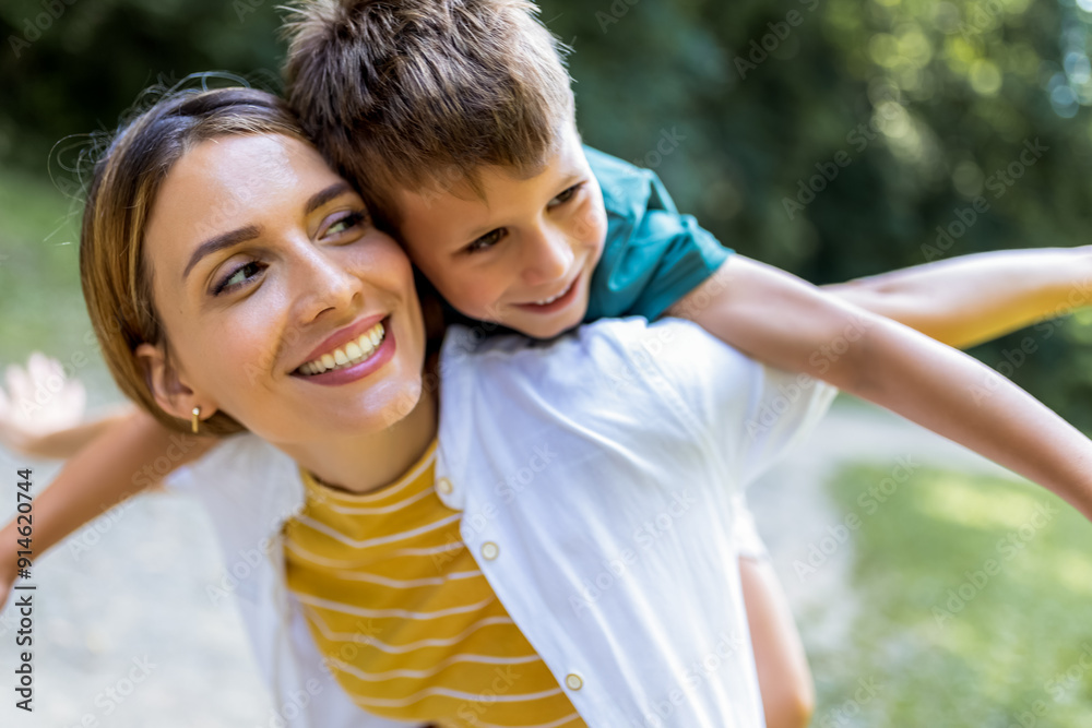 Young beautiful mother playing with her son piggy back.