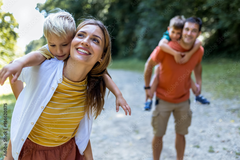 Mother and father with their sons playing in the park. They are carrying them on their back.