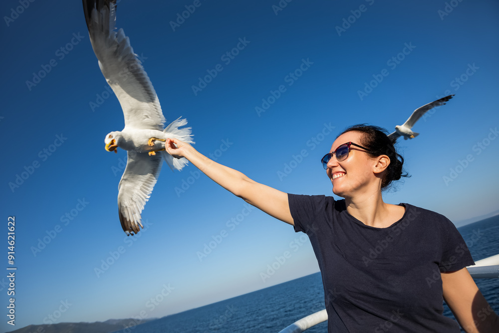 A woman feeds seagulls on a ferry in the middle of an sea.