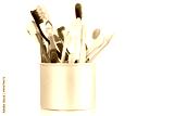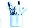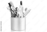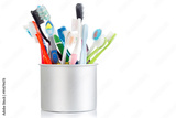 Group of old and used toothbrush in metal cup