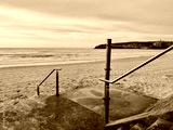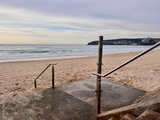 A beach shower and stone stairwell overlooking the ocean on a cloudy day in Australia
