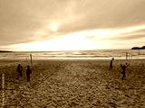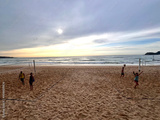 Two seperate games of volleyball playing back to back after a cloudy sunrise on an Australian beach in winter