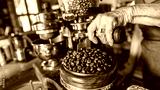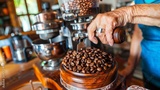 Roasted Coffee Beans in a Wooden Bowl Under the Machine Person Using Antique Coffee Grinder at Home
