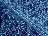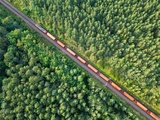 Aerial view of a red train transporting materials on tracks through a coniferous forest in Europe, delivery and transportation of goods, economic development, import, export, and railway transport.