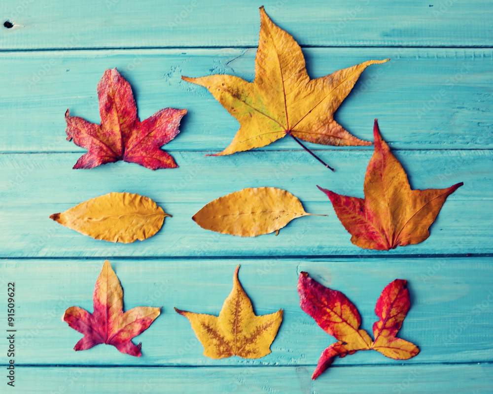 Autumn leafs over turquoise wood