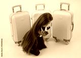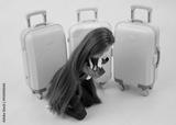 Tired and sad common doll female tourist with many suitcases on pink background.