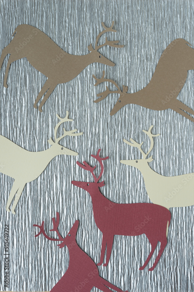 machine-cut holiday paper reindeers arranged on metallic silver crepe paper with crinkled texture