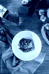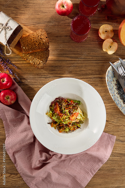 Fresh Vegetable Salad with Apples, Bread, and Juice on Wooden Table - Rustic Healthy Meal