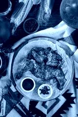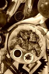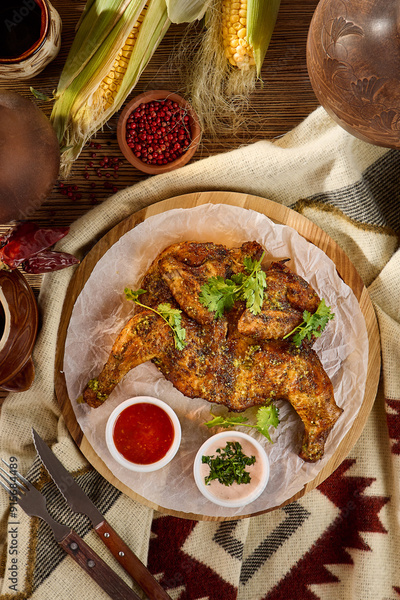 Delicious Georgian Style Chicken Tabaka with Assorted Sauces on Wooden Platter