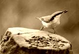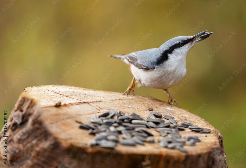 Bird feeding on bird feeder with sunflower seeds. European nuthatch