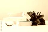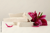 Stones platform podium, flower petal on beige background. Minimal empty display product presentation scene.