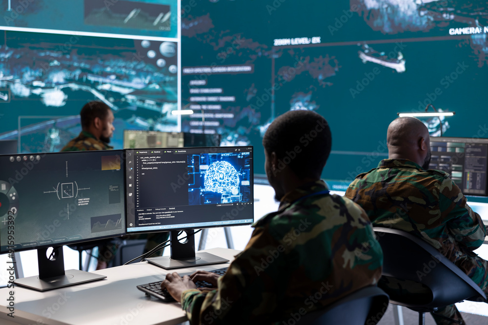 Military professionals in a mission control center employs modern technology to analyze satellite imagery and data, tracking threats and support intelligence operations. Surveillance system.