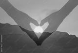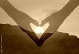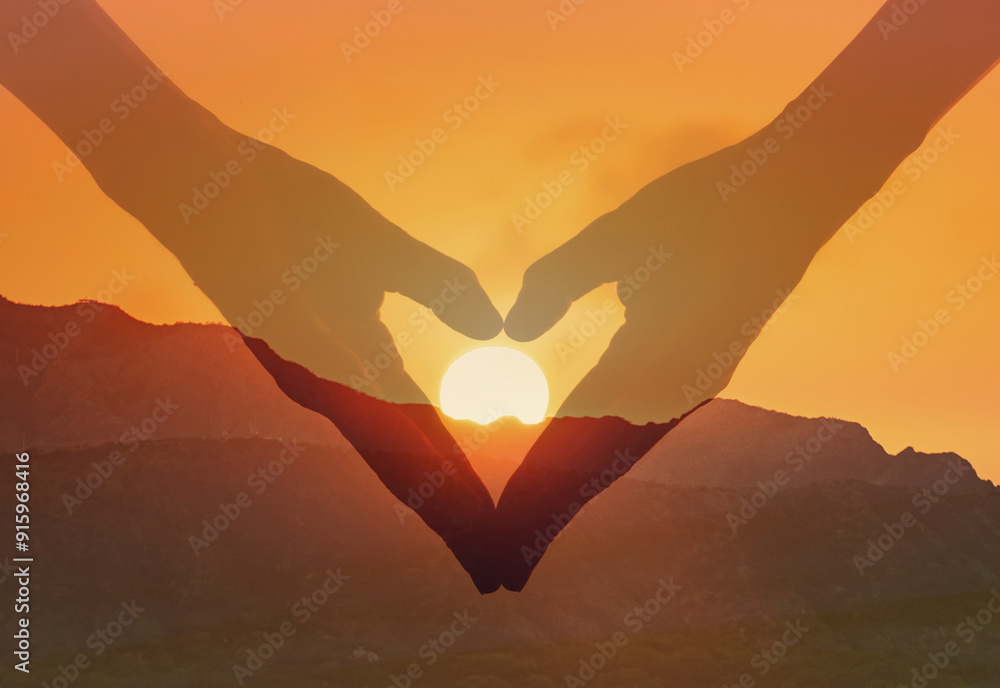 Woman making heart shape hands up to the sunset enjoying life and summer, nature, happiness.