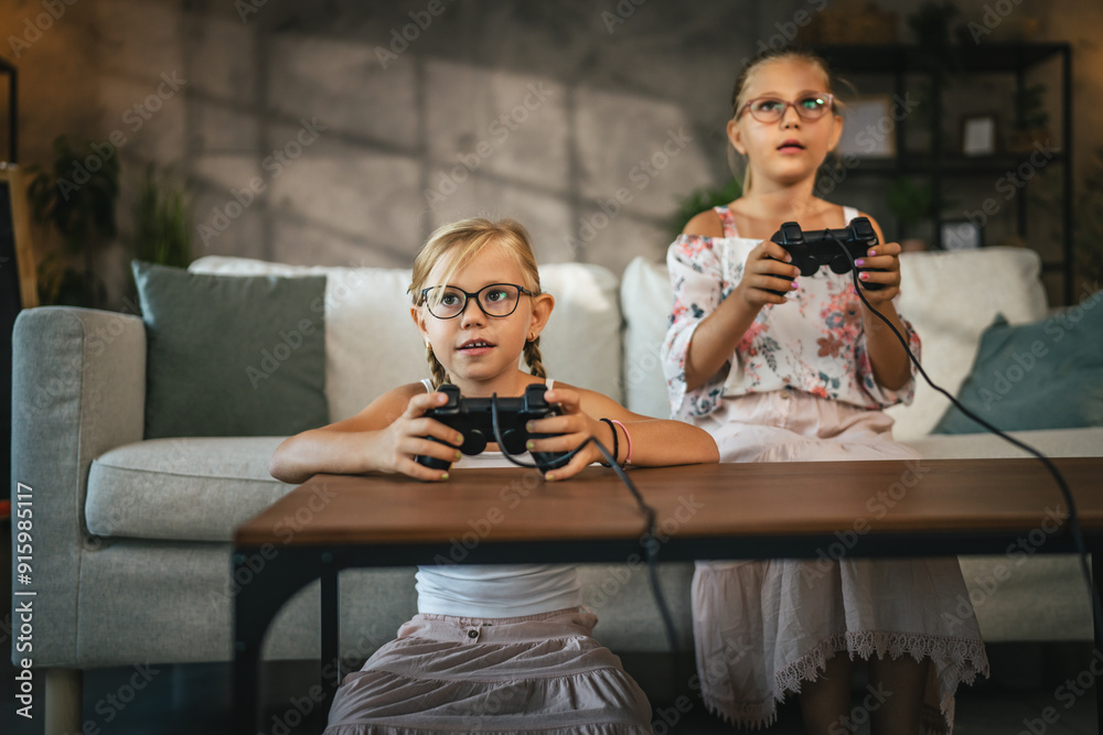 Young girls child play video games on joystick at home