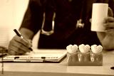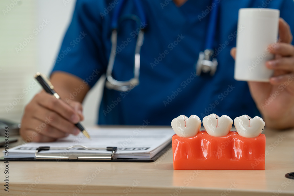 A male doctor sits working at the table in a dentist's clinic, explaining tooth decay, wisdom teeth, broken teeth, false teeth, and recommended treatments to patients.