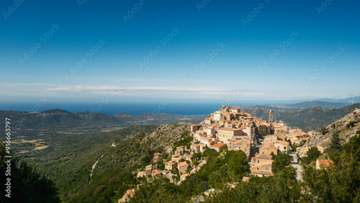 The iconic perched mountain village of Speloncato in the Balagne region of Corsica on a bright sunny day with the Reginu valley and Mediterranean sea in the distance