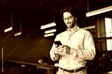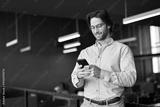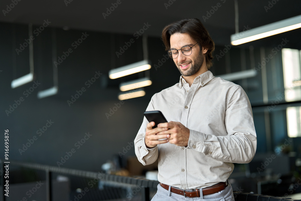 Busy young European business man using cellphone at work standing in office. Smiling male executive, businessman employee or entrepreneur holding smartphone working on mobile cell phone at work.