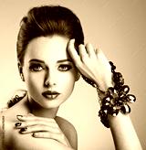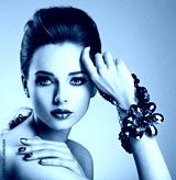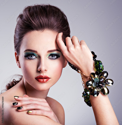 Beautiful woman face with fashion green make-up and jewelry on h