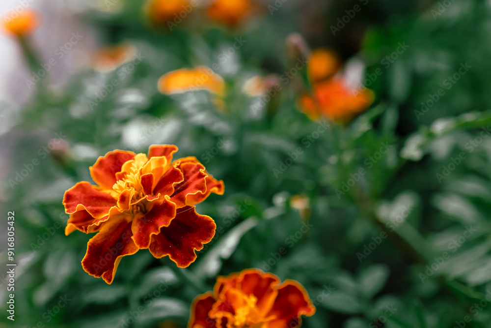 Close-up of velvet flowers in the flowerbed. Orange-yellow flowers