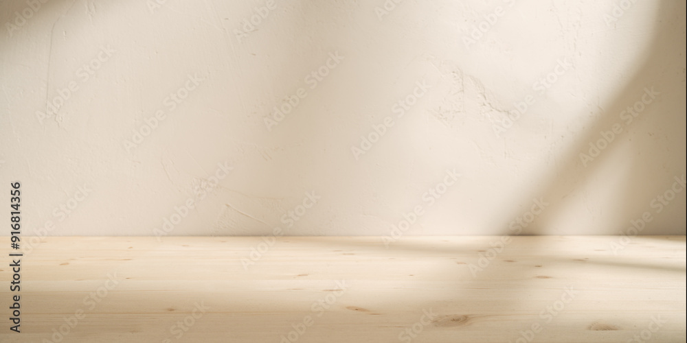 Empty wooden table on stucco background with shadow on the wall. Mock up for branding products, presentation, food and health care.