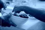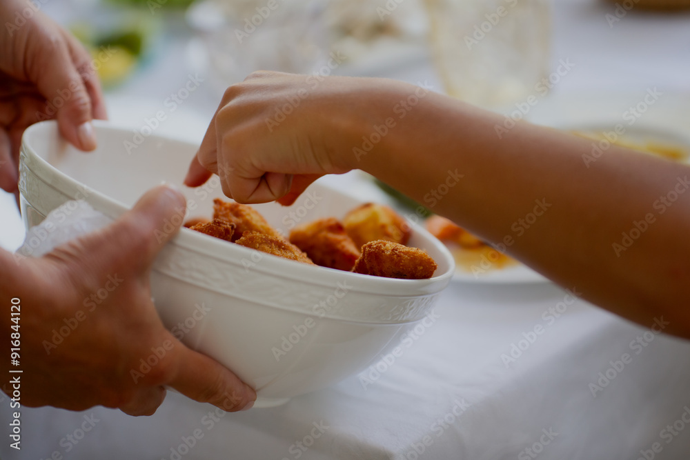 Child taking home made chicken nuggets close up from white bowl in dinner in summer