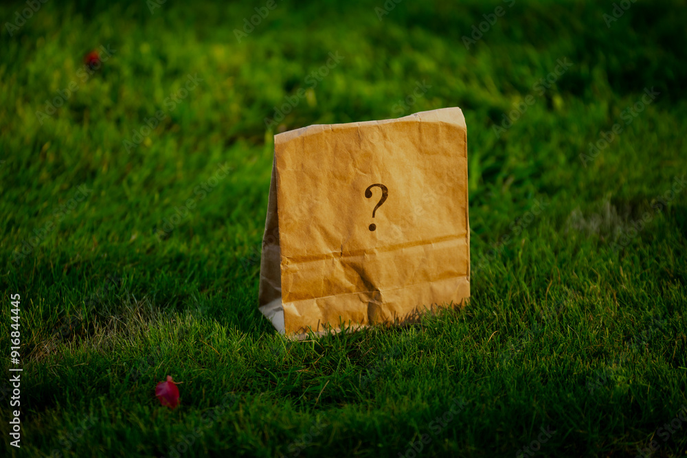 Surprise mysterious paper back with a question mark close up on green grass for a magician kit