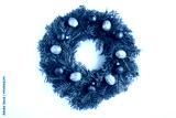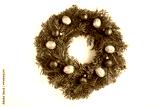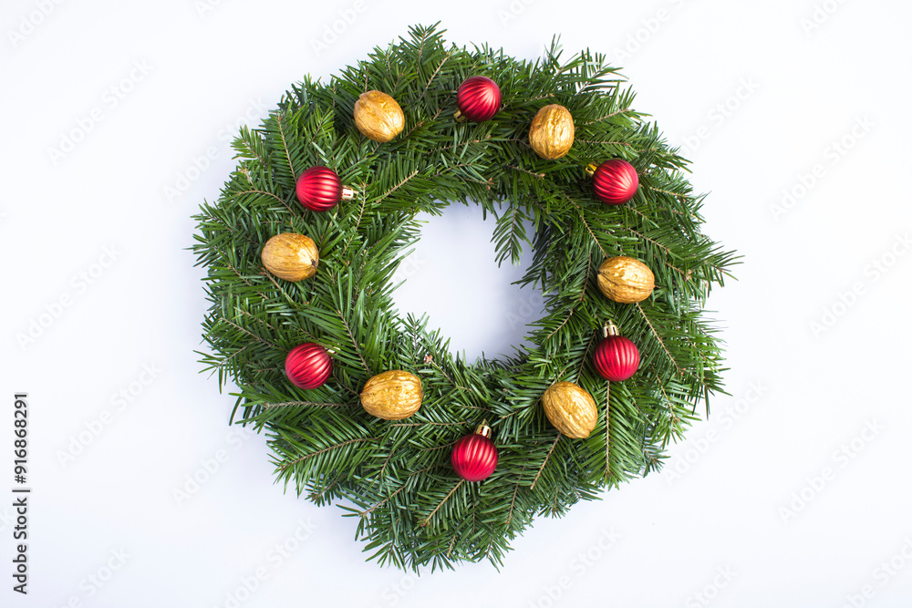 Christmas wreath with red bead and gold nut on the white background. Top view. Close-up.